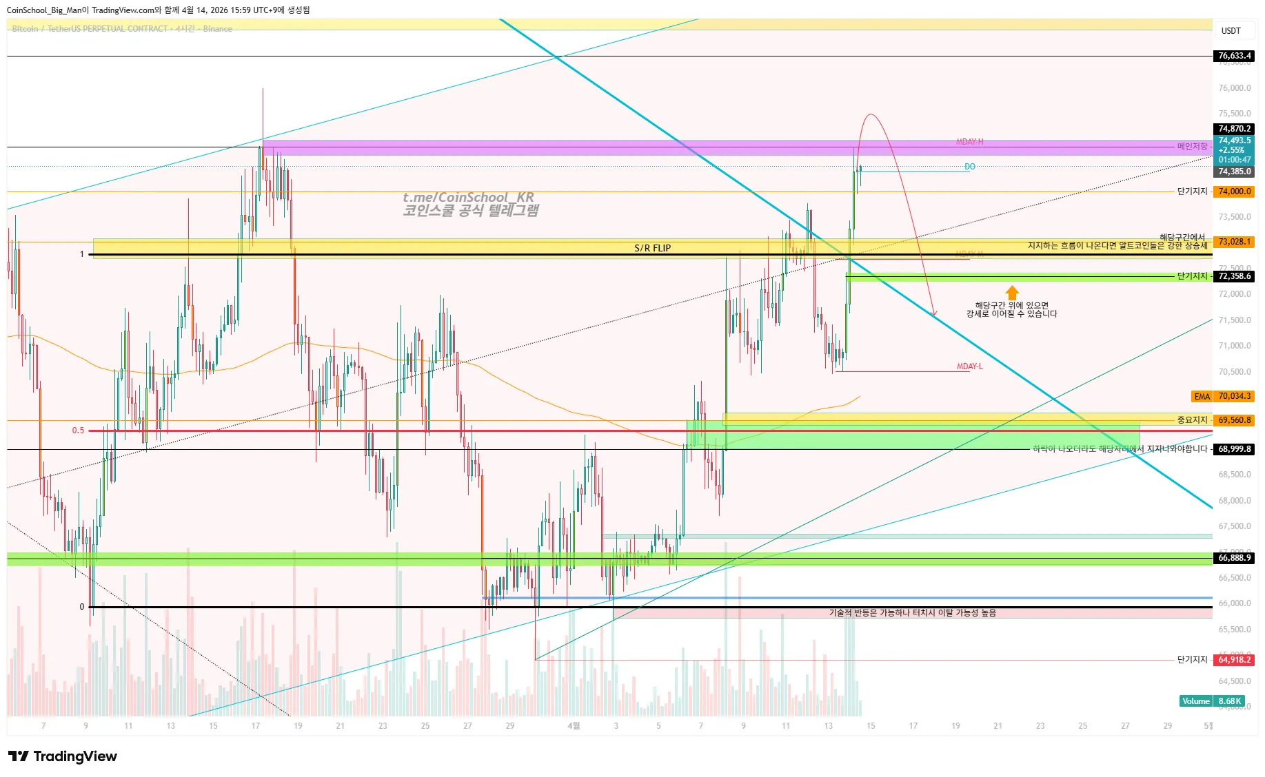 상승 시에는 73.5K 위에서 안착하는 흐름이 중요하며 78K 돌파 전까지는 보수적인 접근이 필요합니다. 하락 시에는 71.6K가 무너지면 이번 반등세가 끝난 것으로 보고 70K 붕괴 여부를 확인해야 합니다.