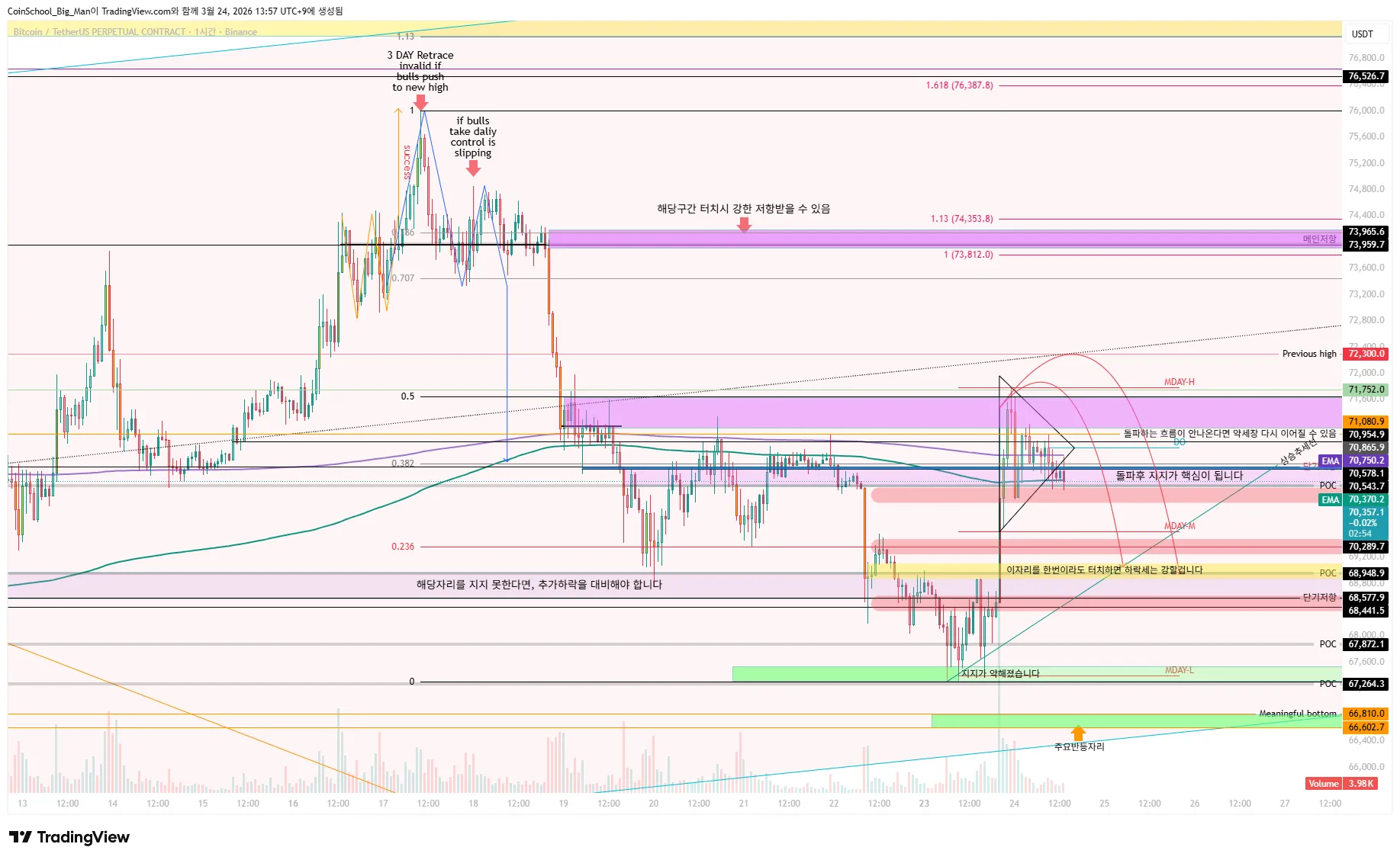 만약 68.8k가 깨지면 다시 큰 하락이 시작되면서 63k나 그 밑으로도 확 밀릴 수 다 판단