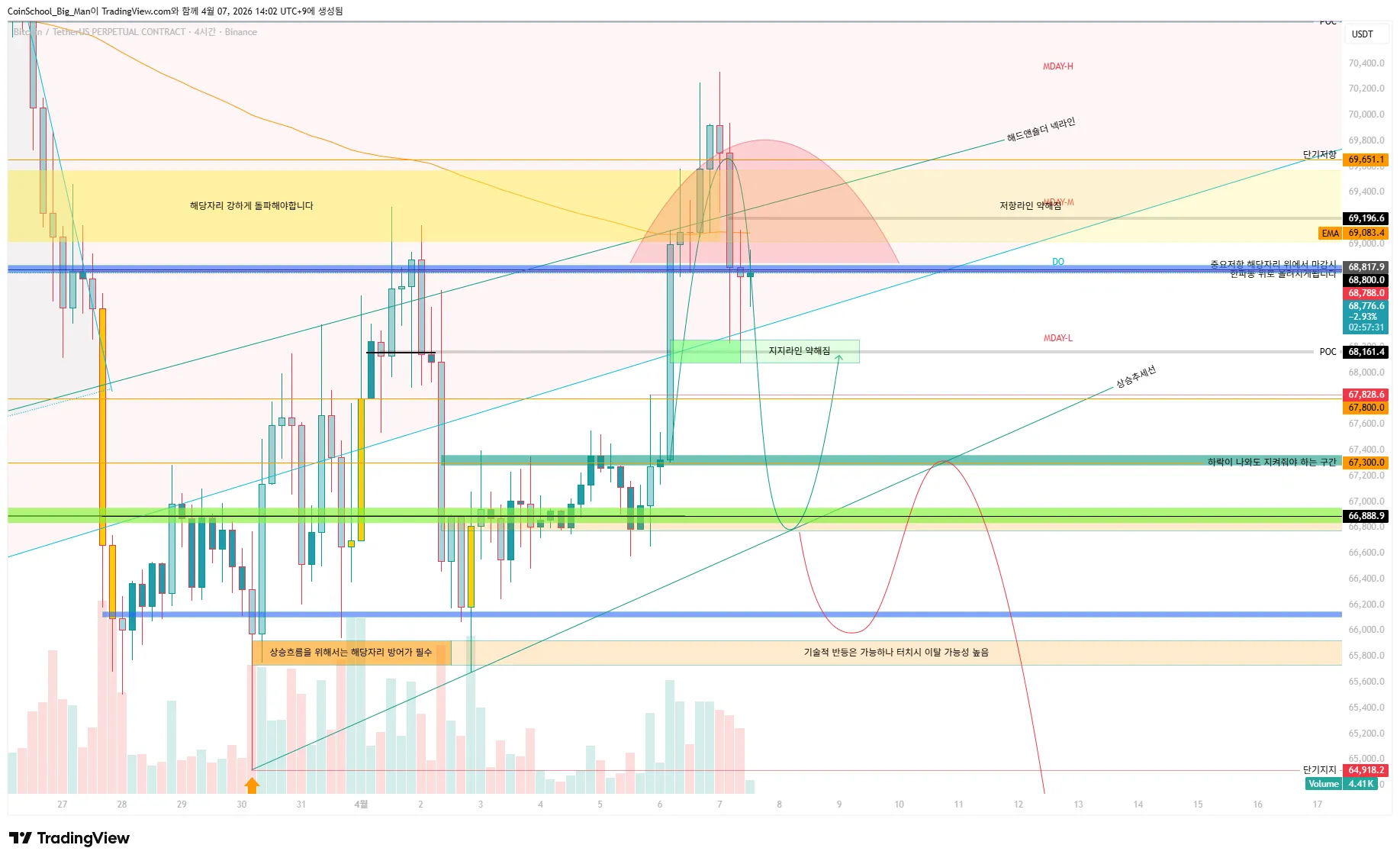 노란색 박스를 결국 돌파마감을 하지못하고 하락세가 나오고있습니다. 66,950달러에서 67,800달러 부근의 지지 여부를 꼭 확인해야 합니다.