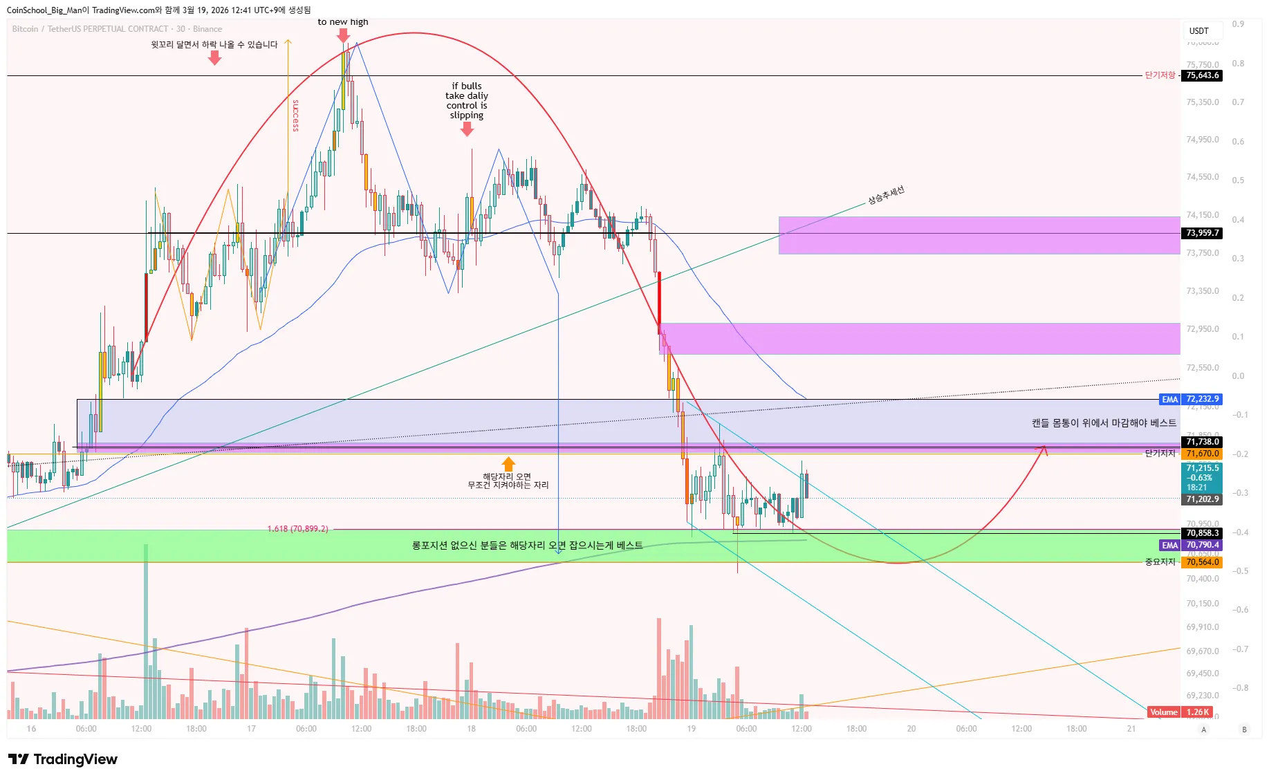 반등이 나오더라도 73.3K에서 73.8K 구간을 확실히 뚫어주지 못한다면 추가 하락 가능성이 매우 높습니다.