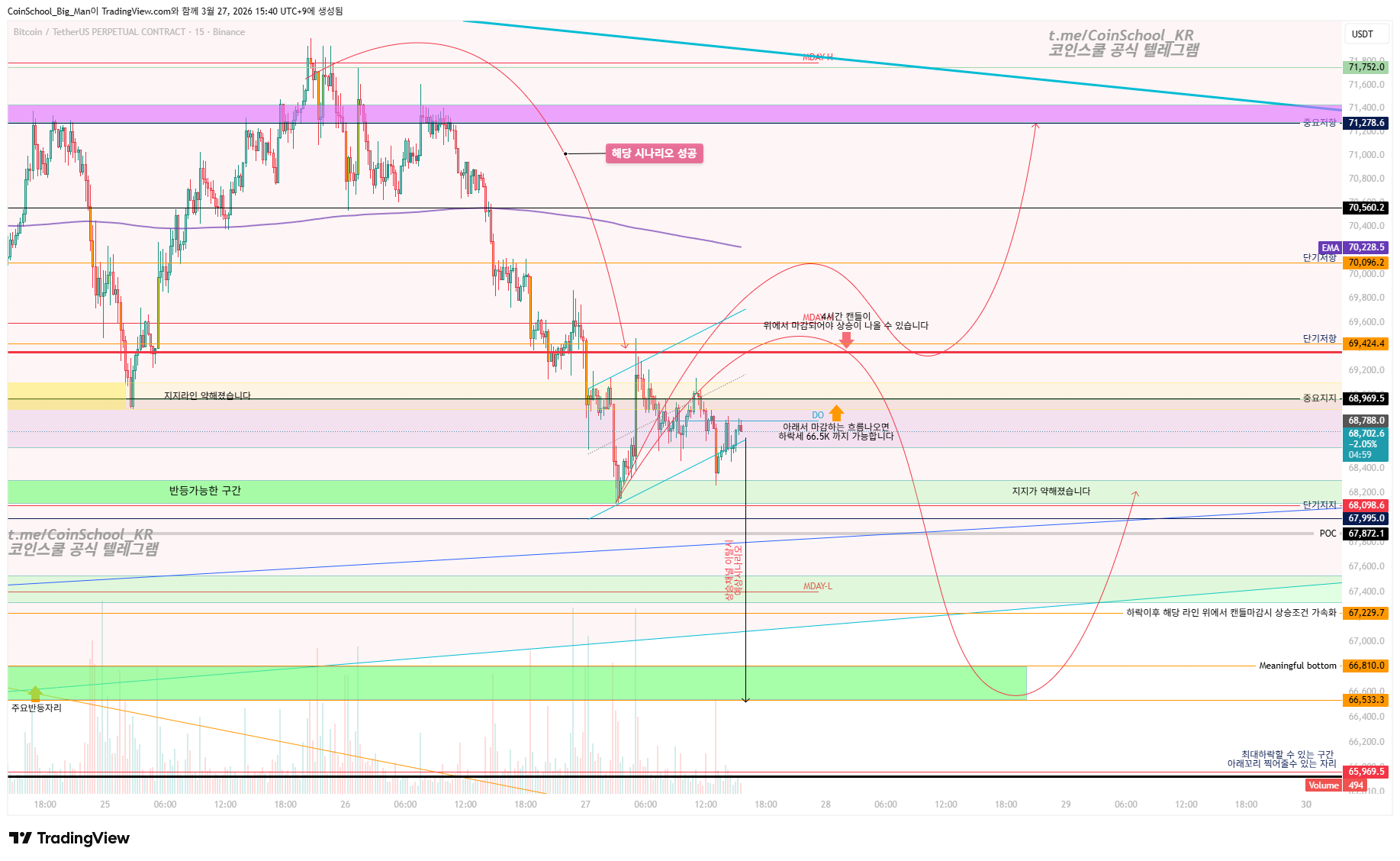 또한, 주말오기전에 69.5k 에서 움직임이 나오는데 상승하더라도 71.5K에서 72.8K 구간의 매물을 어떻게 소화하느냐가 이번 단기 반등의 키 포인트가 됩니다 이번 상승이 나오더라도 단순한 기술적 반등인 ABC 파동의 연장선일 뿐이라고 봅니다.