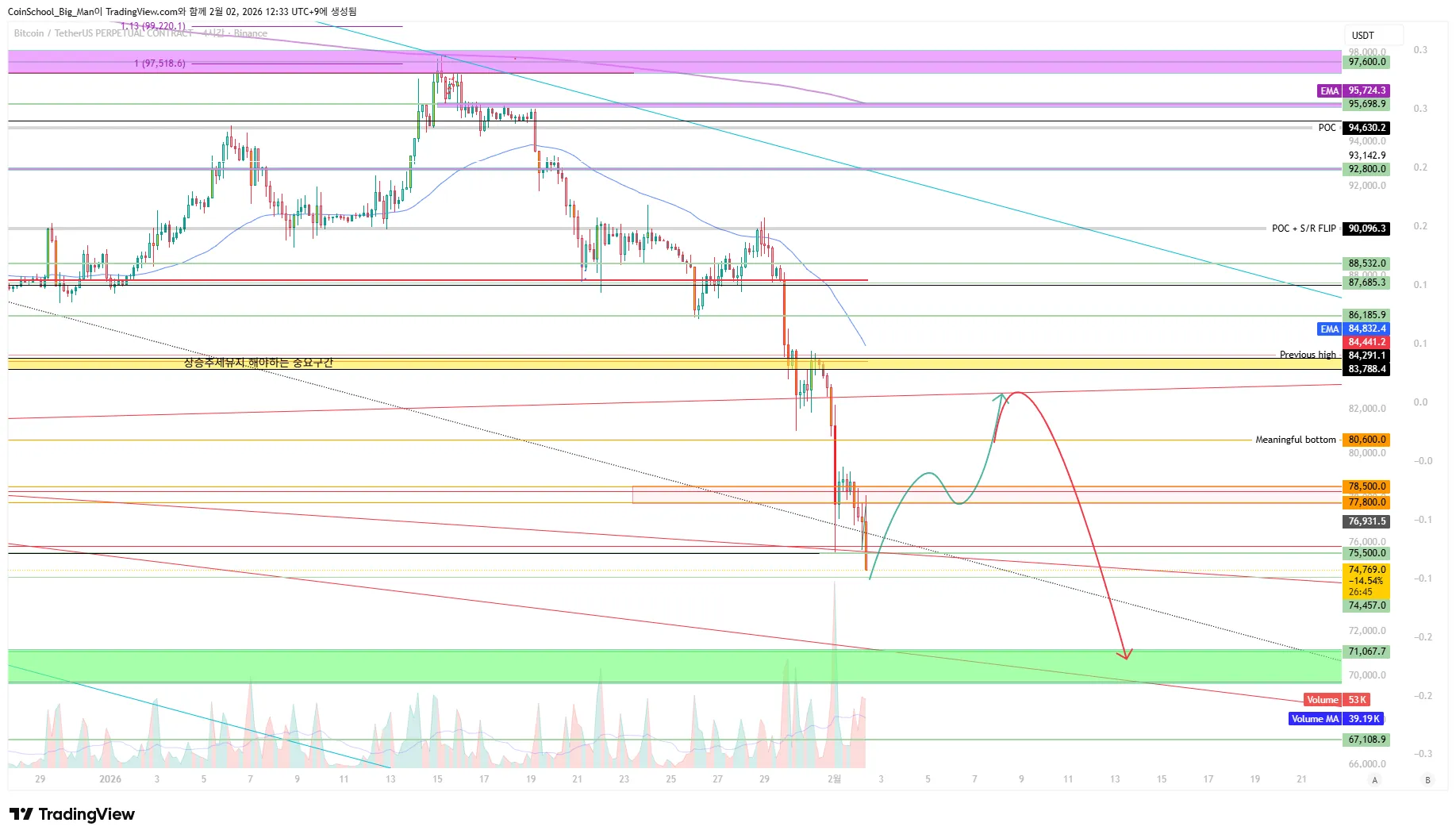 $BTC 1시간봉 주말사이 75.7K를 찍어주며 반등세가 나왔지만, 하락세를 이기지 못했습니다. 또한 매수세가 이어지지 못하고 있는건 사실입니다 단, 가격하락과 코인베이스 프리미엄 지표 상승 -> 최근에 하락세에 2번째 상승다이버전스가 컨펌 되었습니다. 저점갱신을 계속 하고 있는 시점에서 74K 마지노선까지 이탈하게되면 69K - 52K 까지도 하락 할 수있는것을 염두에 두어야 합니다 롱포지션을 접근해야할 이유는 없으나 손절라인도 명확하기때문에 접근해 볼만하다고 판단됩니다.