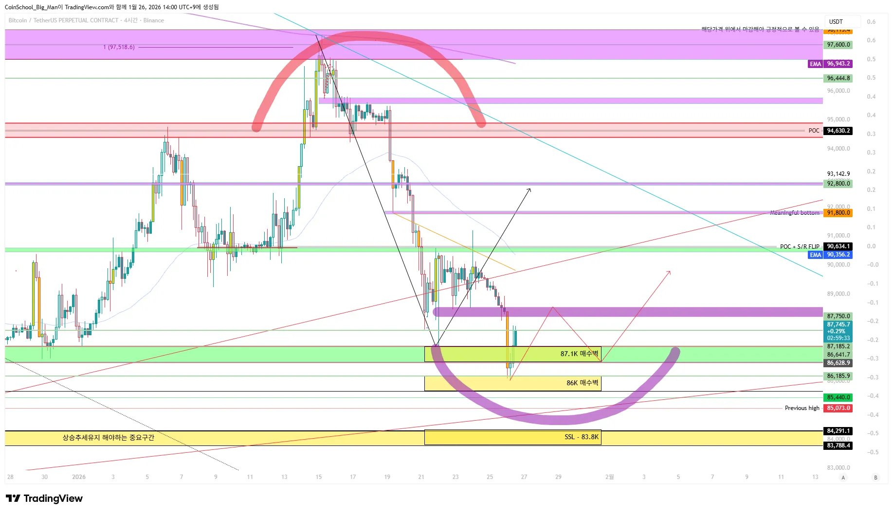 88.2K 까지 돌파 후 마감을 하지 않는다면, 86.5K / 84K 까지 하락이 나올 수 있다는 점을 감안하셔야 합니다
