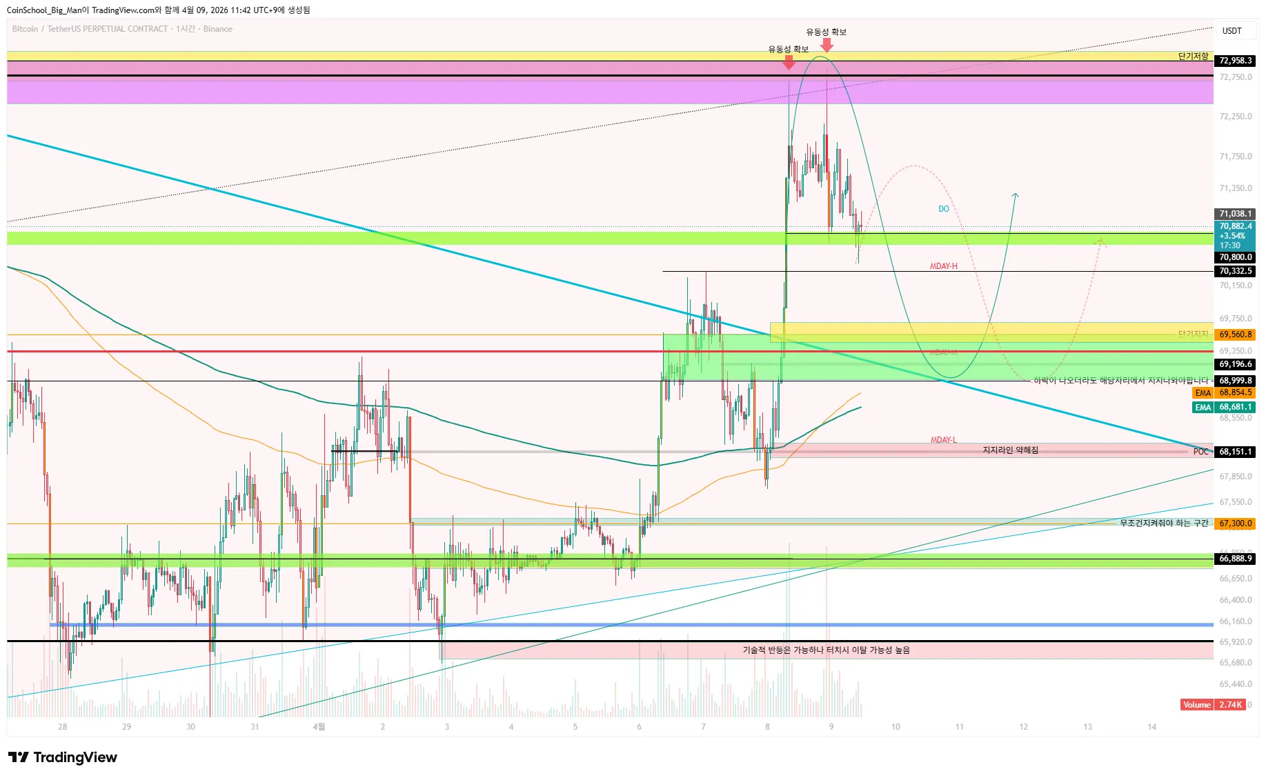 70.8K를 단기 생명선으로 잡고 대응하는 것이 가장 안전한 전략