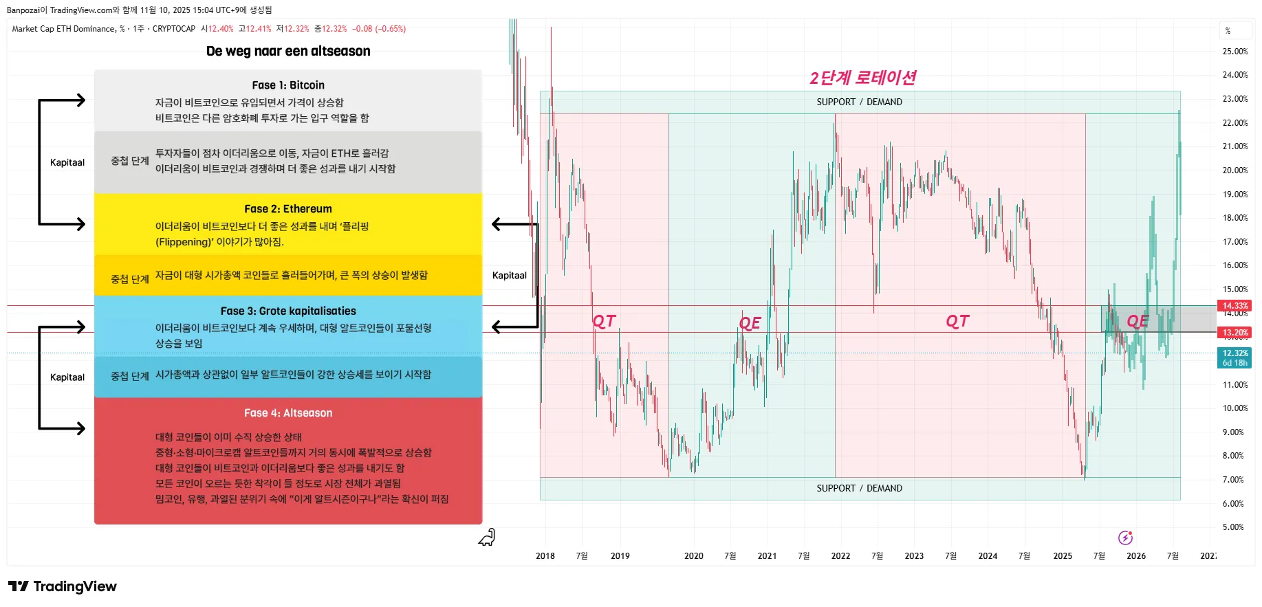 비트 → 이더 2단계 로테이션 확인, ETH 도미넌스 13% 돌파 후 14%대 안착, 다음 목표 16~18%