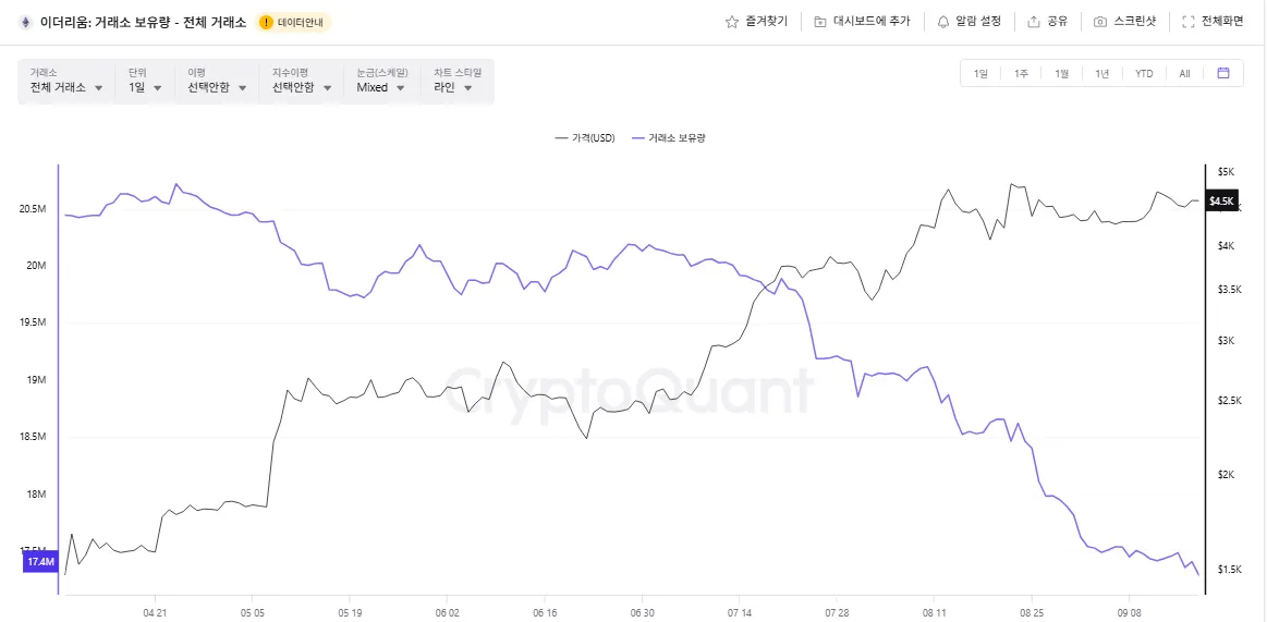 온체인 거래소 내 ETH 재고 감소는 대량의 매수세가 따라 붙습니다.