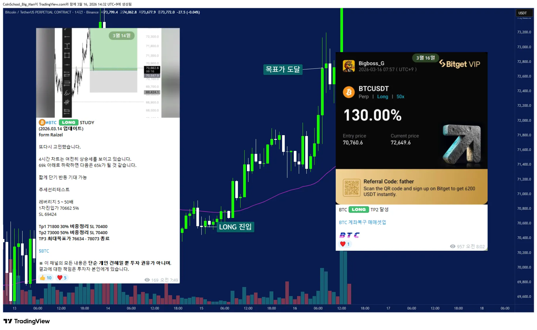 LONG 70,760 단타진입 (50% 비중 수익실현) SHORT 수익실현 이후 신규 포지션 잡는중
