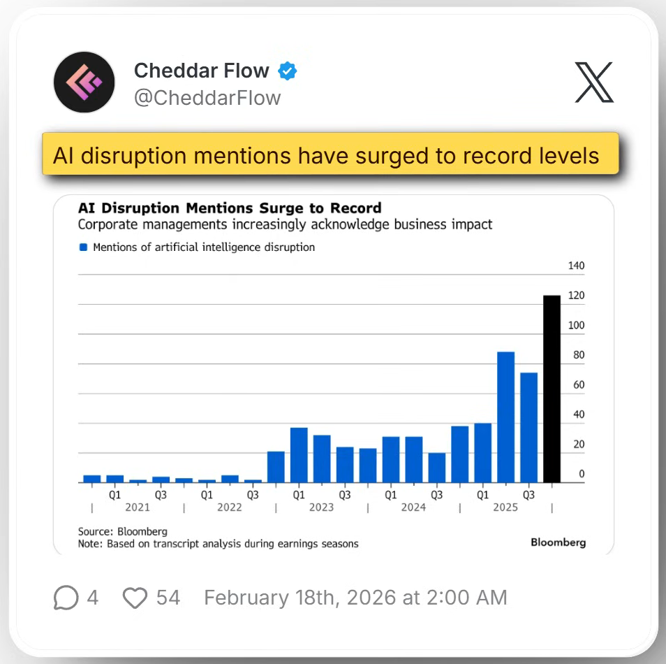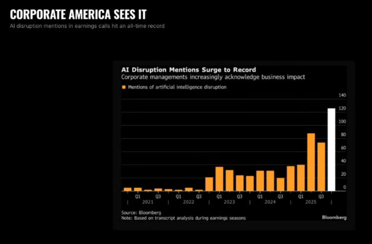 Q4 실적 발표에서 AI 디스럽션 언급이 역대급으로 늘고 거의 2배 수준