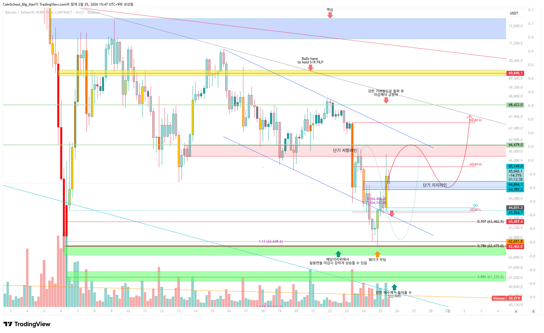 예상했던 지점에서 단기 이탈은 발생했으나, 4시간 봉이 62,650달러 위에서 종가를 형성하며 강력한 저가 매수세를 확인시켜 주었습니다. 시장은 현재 단기 매수세가 붙은 구간에 진입했습니다.