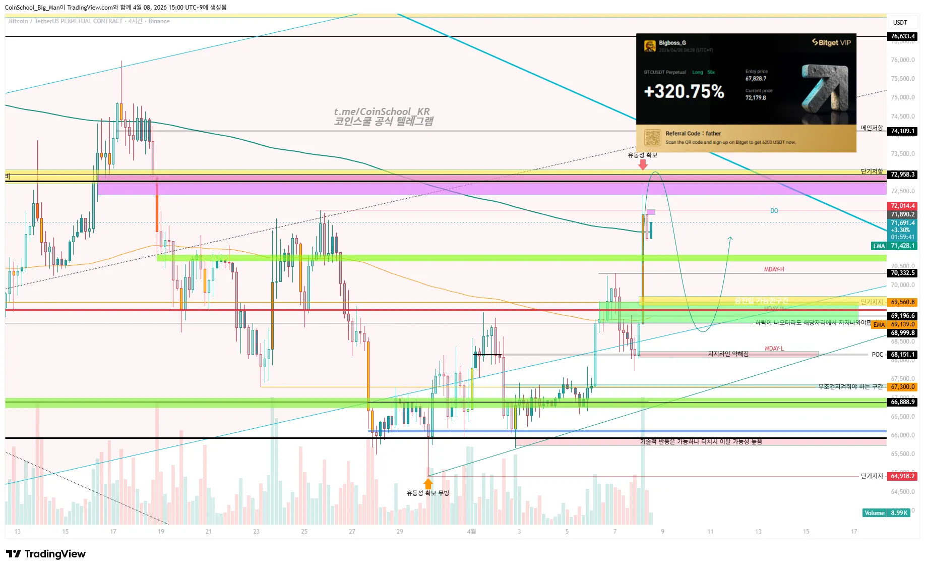72.5K에서 73K 사이가 워낙 강력한 저항대라 여기를 확실히 뚫고 안착하지 못하면 상승 흐름 이어가기 어렵고 위쪽 유동성을 이미 털어서 치고 올라갈 힘도 부족해 보입니다