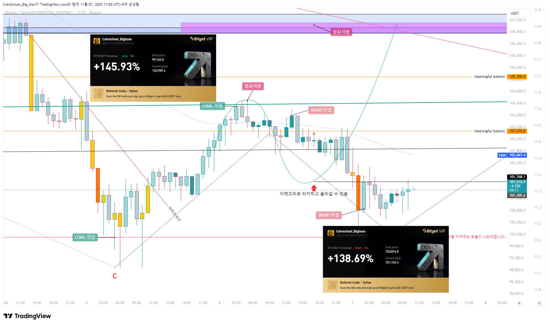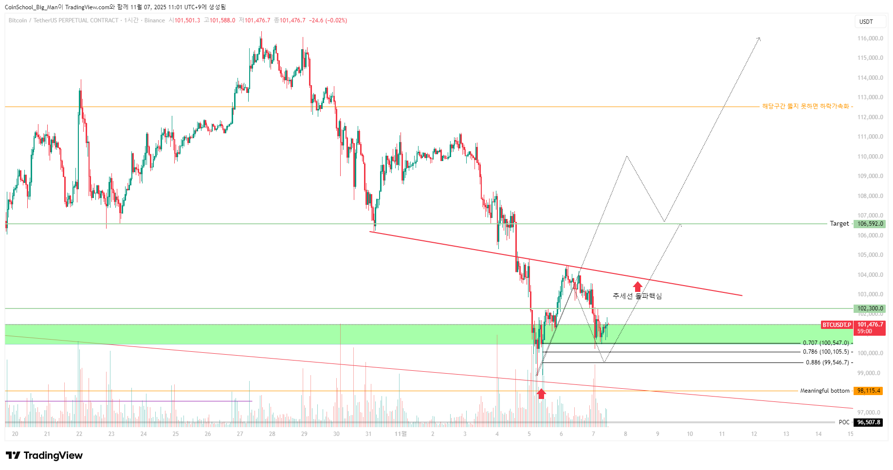 하지만 이 관점보다도 상승관점을 보기위해서는 코인스쿨에서는 이자리에서는 버티는 흐름이 나오면서 102300 돌파가 핵심이 됩니다