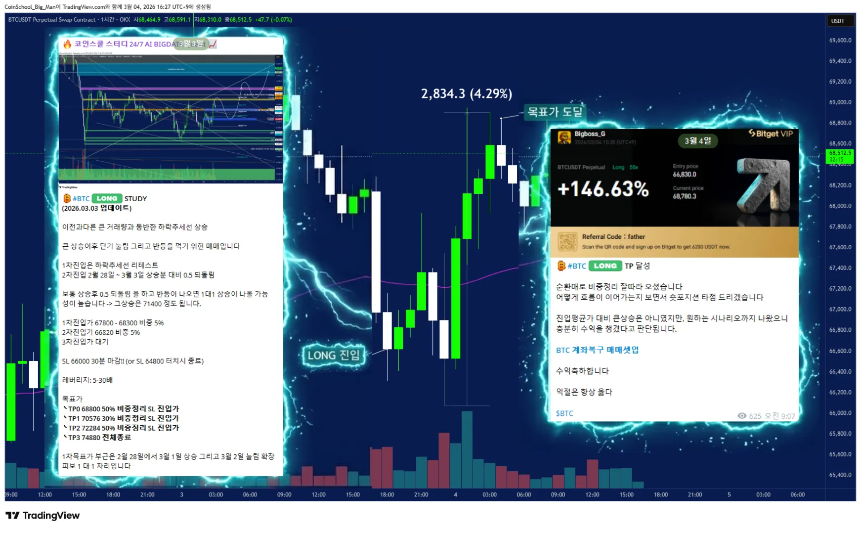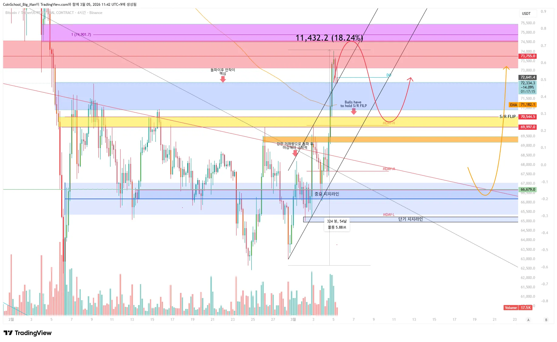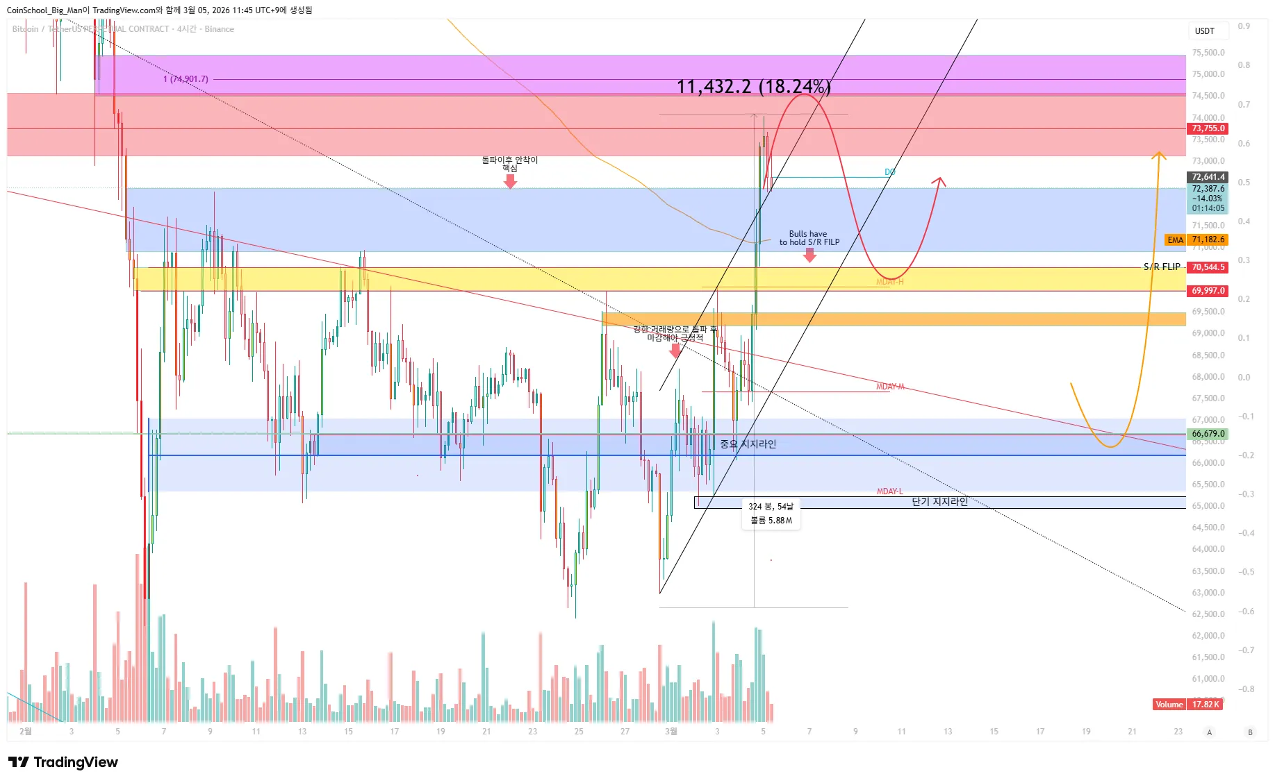 이 구간을 지지선으로 확보한다면 72K와 74K를 향한 단계적인 상승세가 유지될 수 있습니다.