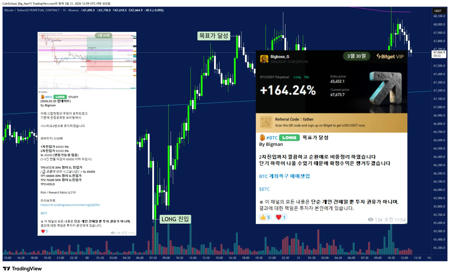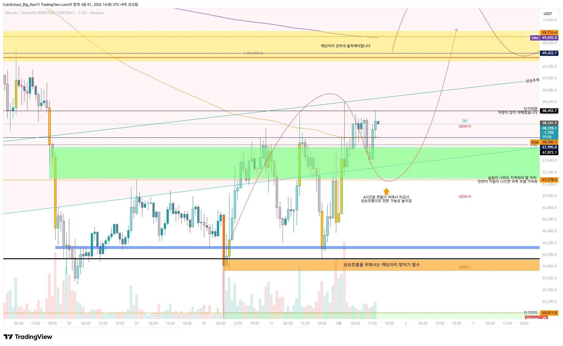 오늘은 위로 69K에서 69.8K 그리고 아래로 66.3K에서 67.1K 라인을 중요하게 체크
