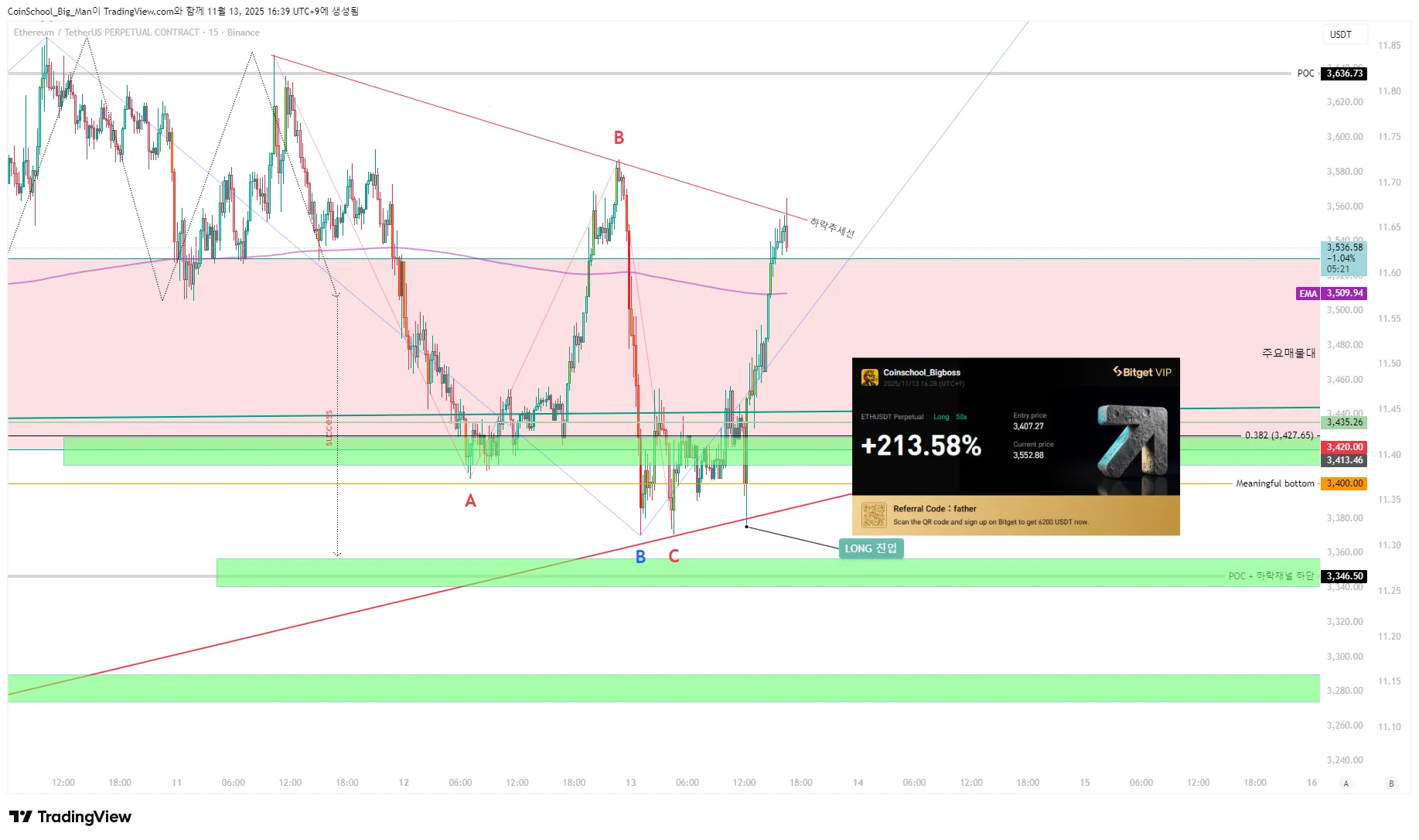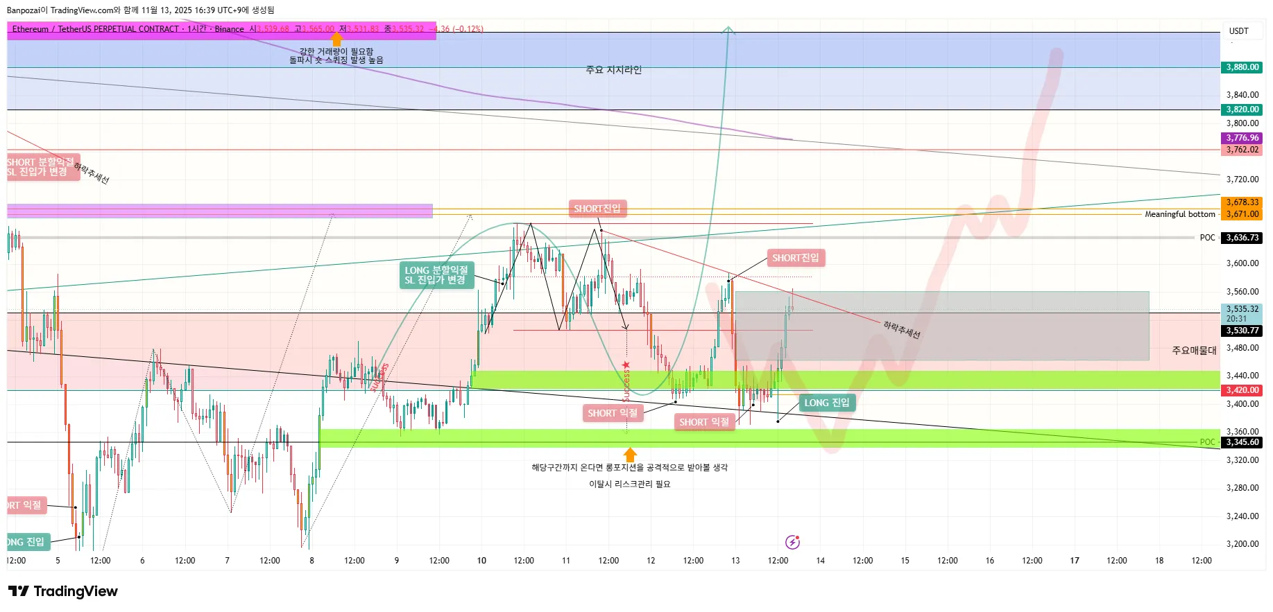 -> 하락추세선을 돌파하면 단기 3660까지 상승기대 가능 1시간 4시간 프레임 기준 아래서 마감하면 하락이 추가적으로 나올 수 있다고 보고 리스크관리 하겠습니다